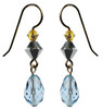 A beautiful lightweight earring. Great for everyday. Incorporate a rare discontinued Swarovski pear shape Crystal in aqua blue and is accented with yellow and silver. Fine metal french ear wire and findings of 14K gold filled metal.